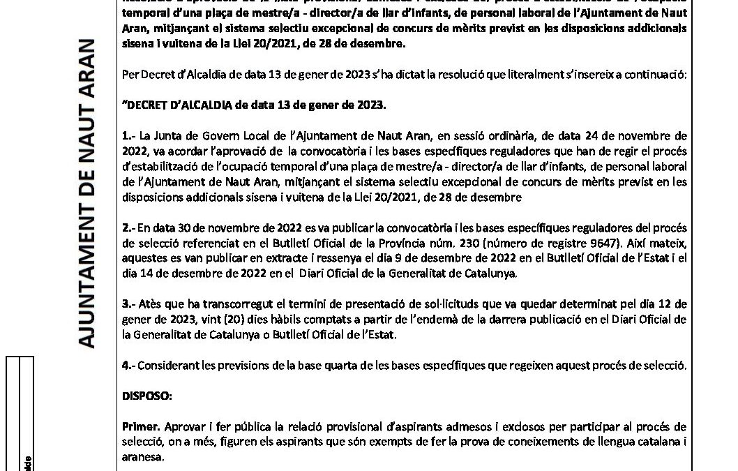 Edicte aprovació llista provisional admesos process Directora Llar Infants