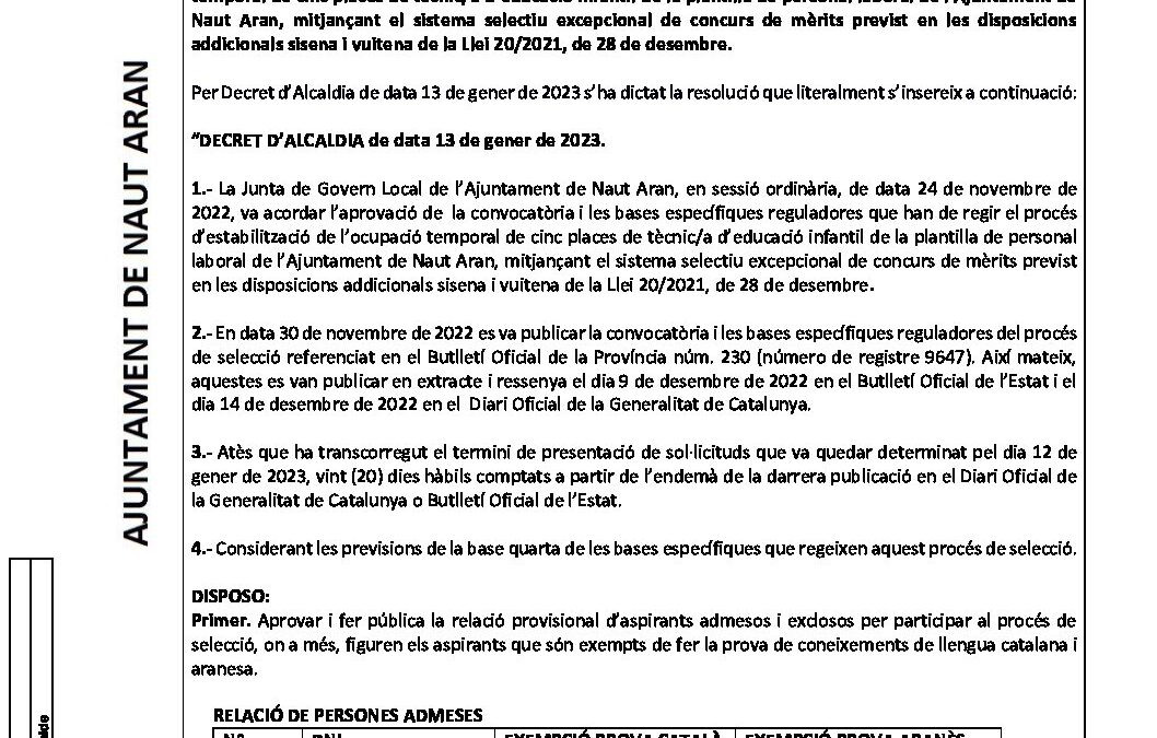 Edicte aprovació llista provisional admesos process Tècnic educació infantil