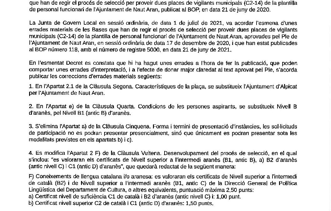 BOP Corrección errores Edicto de convocatoria y bases de dos plazas de vigilantes municipales 16/07/2021